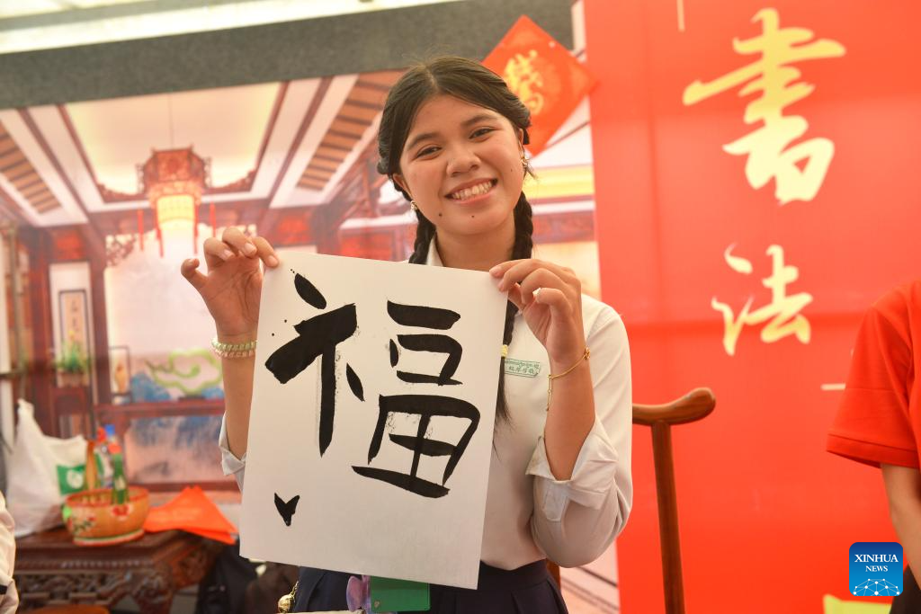 A girl presents her written Chinese character at a Chinese-Cambodian cultural exhibition in Phnom Penh, Cambodia, on Feb. 7, 2026. A Chinese-Cambodian cultural exhibition is being held in Phnom Penh, capital of Cambodia, to celebrate the upcoming Chinese New Year, or the Spring Festival. Lasting from Friday to Sunday, the three-day cultural event was designed to provide revelers with an opportunity to experience the rich tapestry of the Chinese New Year. (Photo by Phearum/Xinhua)