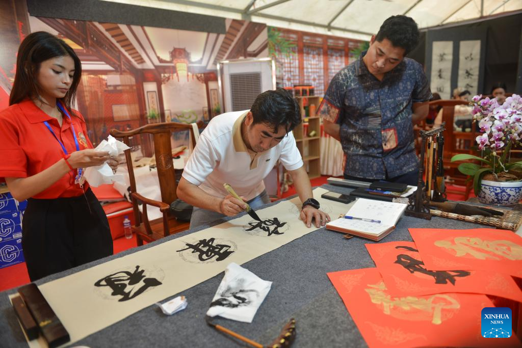 A visitor writes Chinese characters at a Chinese-Cambodian cultural exhibition in Phnom Penh, Cambodia, on Feb. 7, 2026. A Chinese-Cambodian cultural exhibition is being held in Phnom Penh, capital of Cambodia, to celebrate the upcoming Chinese New Year, or the Spring Festival. Lasting from Friday to Sunday, the three-day cultural event was designed to provide revelers with an opportunity to experience the rich tapestry of the Chinese New Year. (Photo by Phearum/Xinhua)