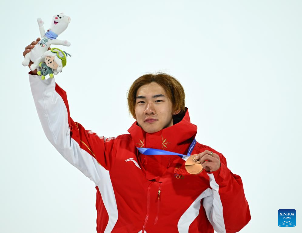 Bronze medalist Su Yiming of China gestures during the awarding ceremony of the Men's Snowboard Big Air at the Milan-Cortina 2026 Olympic Winter Games in Livigno, Italy, Feb. 7, 2026. (Xinhua/Zhang Hongxiang)