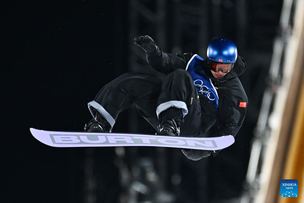 Su Yiming of China competes during the Men's Snowboard Big Air Final at the Milan-Cortina 2026 Olympic Winter Games in Livigno, Italy, Feb. 7, 2026. (Xinhua/Zhang Hongxiang)