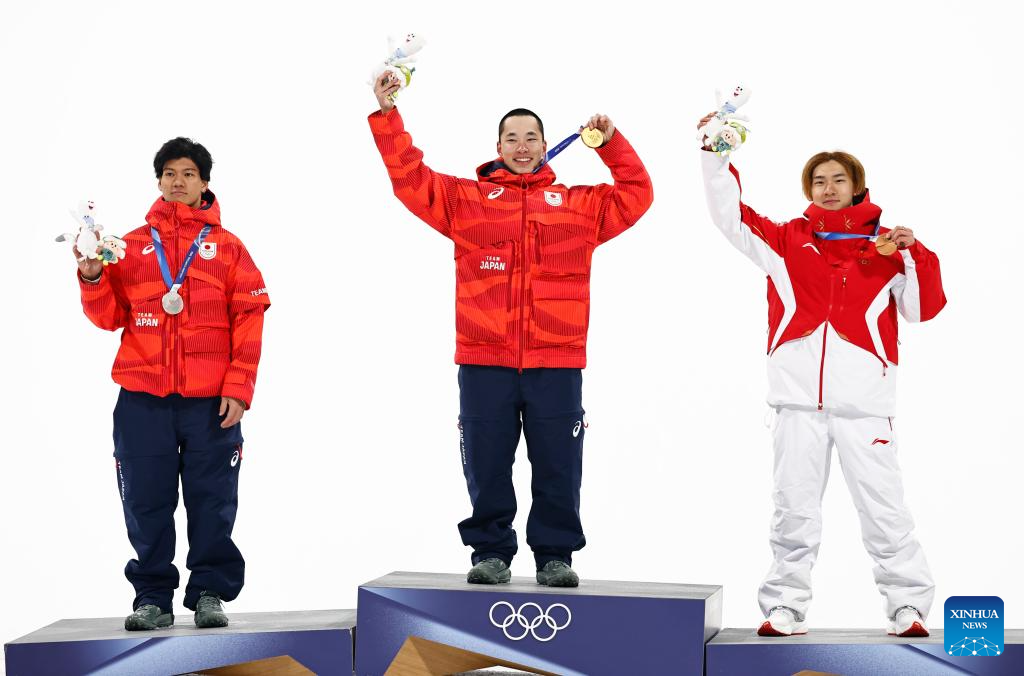 Gold medalist Kimura Kira (C) of Japan, silver medalist Kimata Ryoma (L) of Japan and bronze medalist Su Yiming of China pose for a group photo during the awarding ceremony of the Men's Snowboard Big Air at the Milan-Cortina 2026 Olympic Winter Games in Livigno, Italy, Feb. 7, 2026. (Xinhua/Wang Peng)