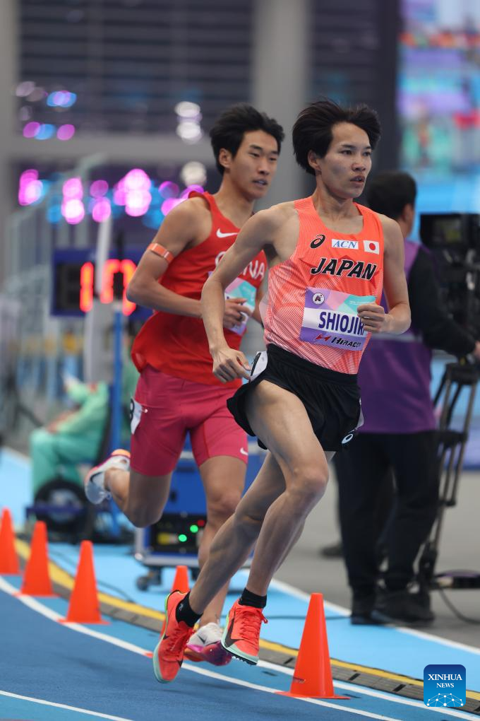Shiojiri Kazuya (R) of Japan competes during the men's 3000m final at the 12th Asian Indoor Athletics Championships 2026 in Tianjin, north China, Feb. 7, 2026. (Xinhua/Sun Fanyue)
