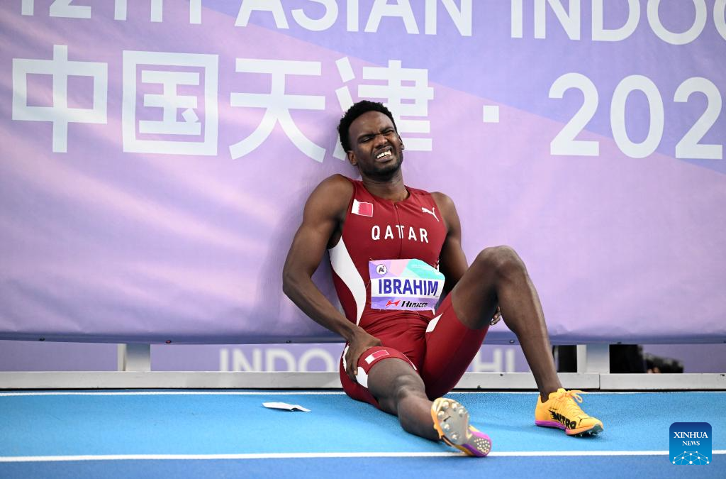Ibrahim Ammar Ismail Y of Qatar reacts after getting injured during the men's 400m final at the 12th Asian Indoor Athletics Championships 2026 in Tianjin, north China, Feb. 7, 2026. (Xinhua/Zhao Zishuo)