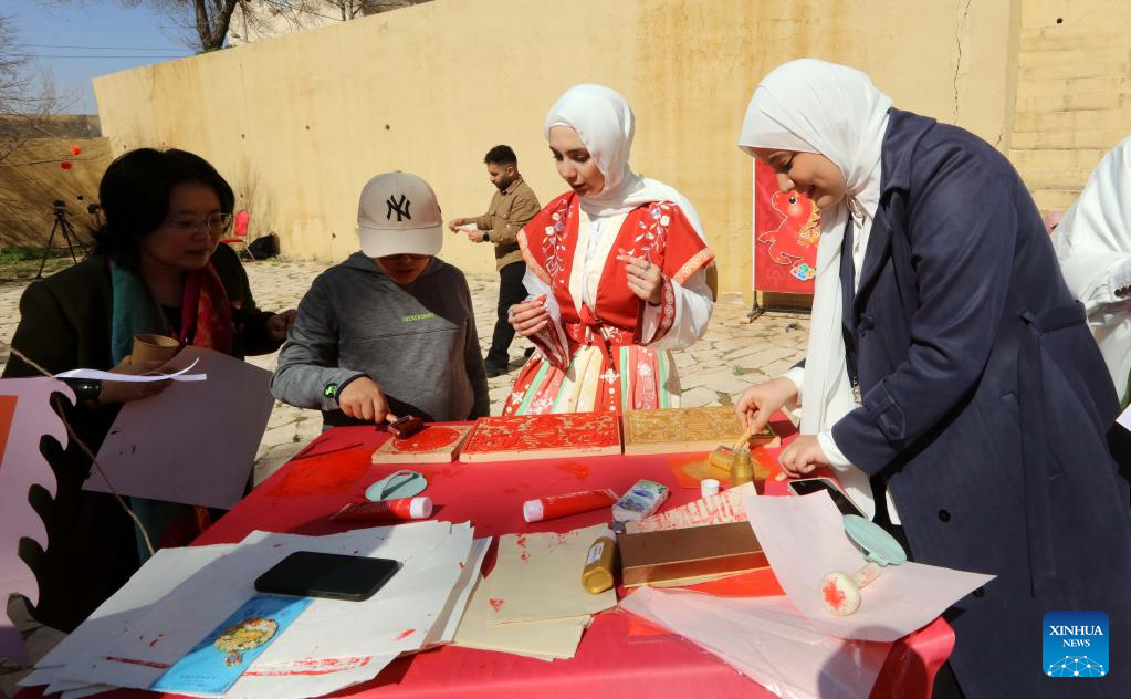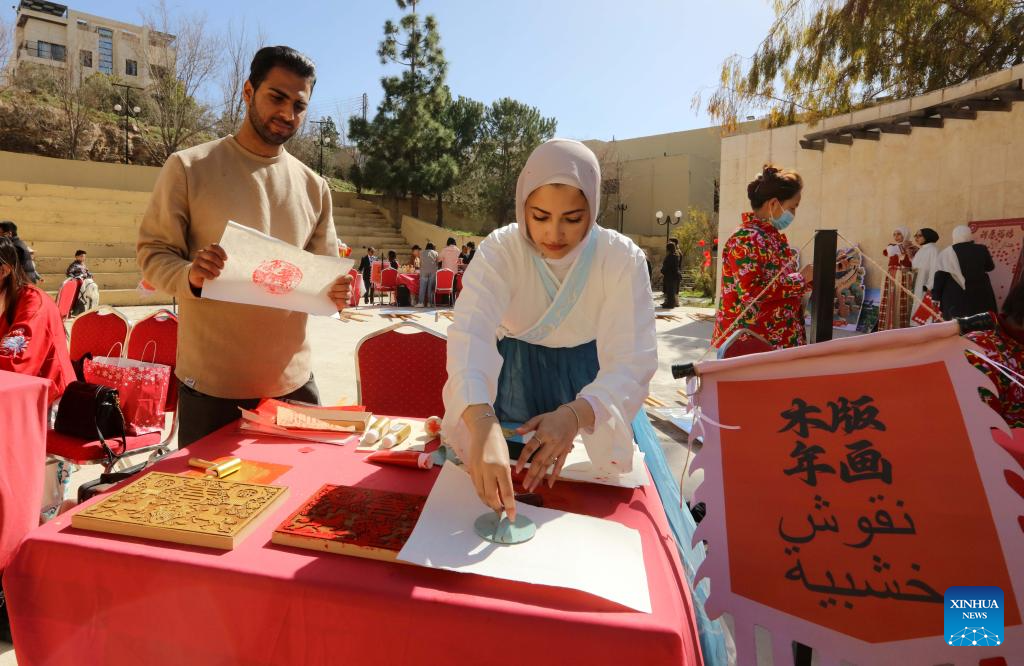 Jordanians try woodblock prints at a Chinese cultural and tourism fair in Amman, Jordan, Feb. 7, 2026. (Photo by Mohammad Abu Ghosh/Xinhua)