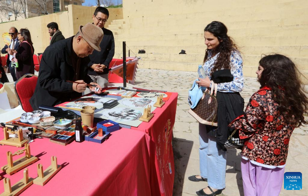 Jordanians watch a Chinese artist painting at a Chinese cultural and tourism fair in Amman, Jordan, Feb. 7, 2026. (Photo by Mohammad Abu Ghosh/Xinhua)