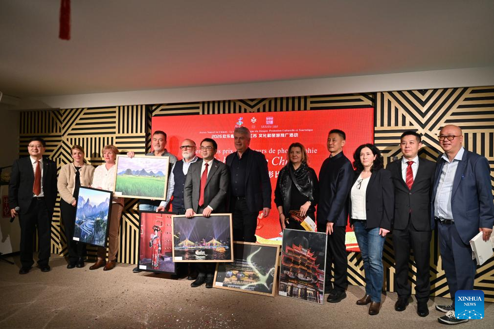 Guests present the photography award to Luxembourgish tourists for the photos they took in China during a promotional event for culture and tourism of east China's Jiangsu Province at the China Cultural Center in Luxembourg, Feb. 7, 2026. (Xinhua/Lyu You)