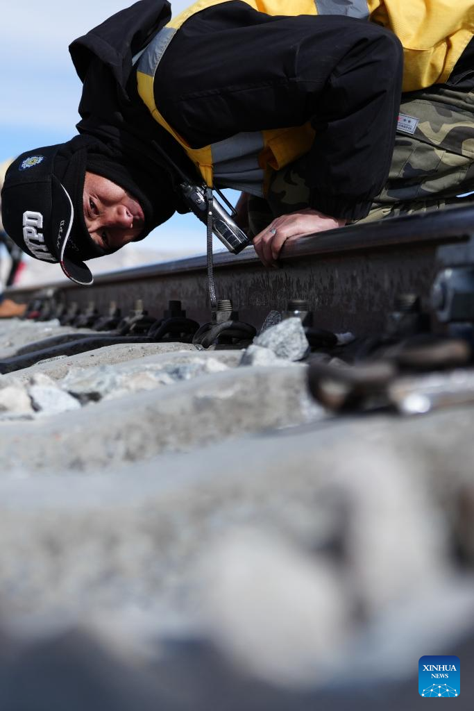 A staff member of the Wangkun Line maintenance workshop in Golmud section under China Railway Qinghai-Xizang Group Co., Ltd. maintains the rail along the Qinghai-Xizang Railway in northwest China's Qinghai Province, Feb. 6, 2026. Deep in the Kunlun Mountains, railway workshop mechanics have intensified patrol at key places along the railway lines, safeguarding the smooth operation of the railway during the Spring Festival travel rush. (Xinhua/Qi Zhiyue)