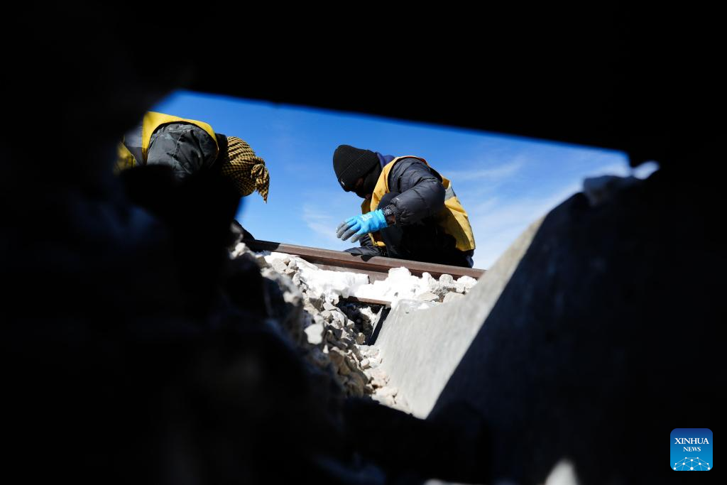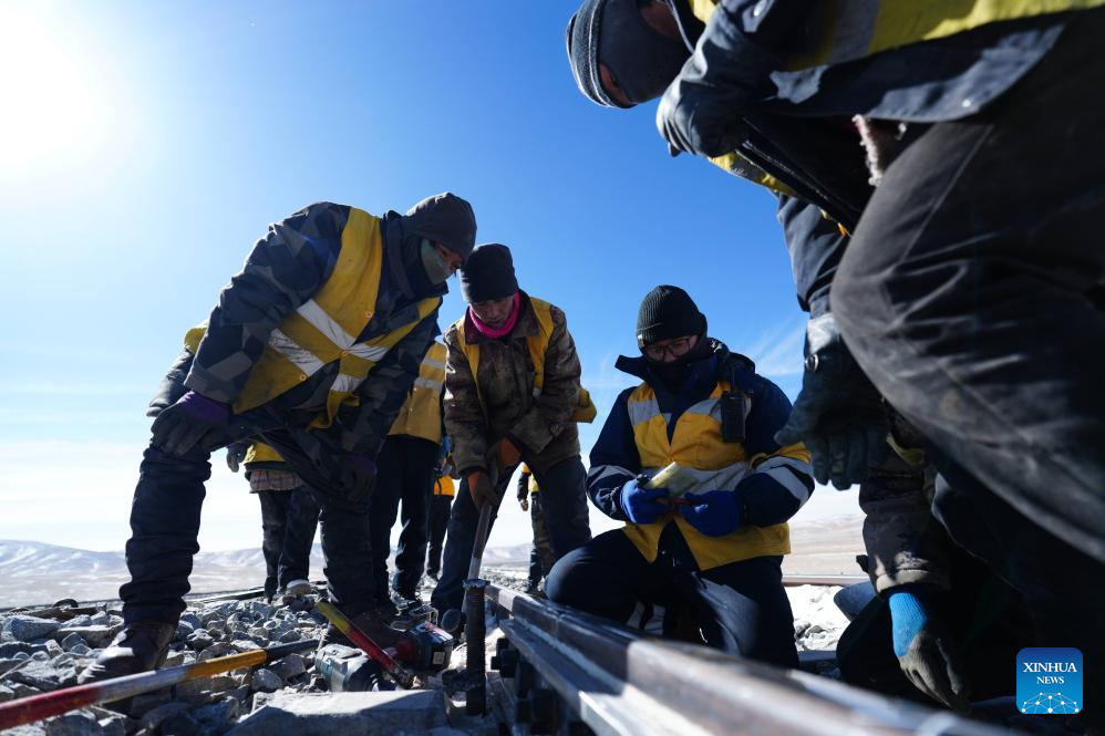 Staff members of the Wangkun Line maintenance workshop in Golmud section under China Railway Qinghai-Xizang Group Co., Ltd. maintain the rail along the Qinghai-Xizang Railway in northwest China's Qinghai Province, Feb. 6, 2026. Deep in the Kunlun Mountains, railway workshop mechanics have intensified patrol at key places along the railway lines, safeguarding the smooth operation of the railway during the Spring Festival travel rush. (Xinhua/Zhang Long)