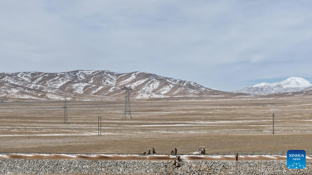 An aerial drone photo taken on Feb. 6, 2026 shows staff members of the Wangkun Line maintenance workshop in Golmud section under China Railway Qinghai-Xizang Group Co., Ltd. maintaining the rail along the Qinghai-Xizang Railway in northwest China's Qinghai Province. Deep in the Kunlun Mountains, railway workshop mechanics have intensified patrol at key places along the railway lines, safeguarding the smooth operation of the railway during the Spring Festival travel rush. (Xinhua/Qi Zhiyue)