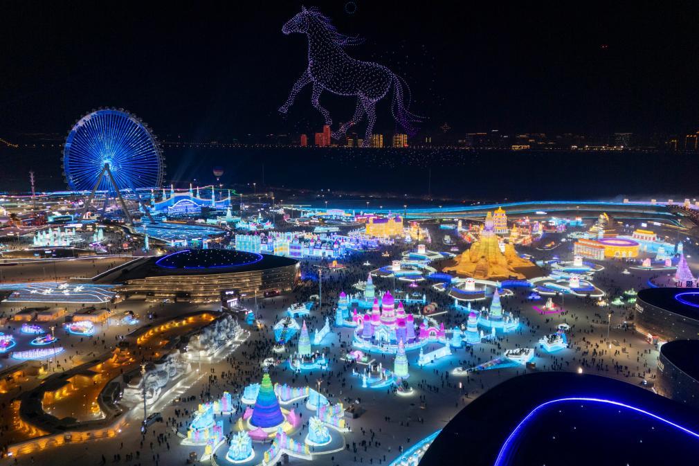 An aerial drone photo taken on Jan. 5, 2026, shows a drone light show at Harbin Ice-Snow World in Harbin, northeast China's Heilongjiang Province. (Xinhua/Zhang Tao)