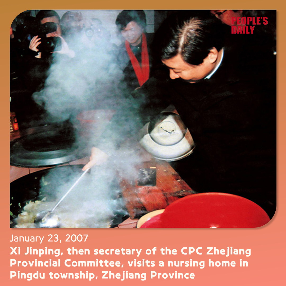 Days before the 2007 Spring Festival, Xi Jinping, then secretary of the Communist Party of China (CPC) Zhejiang Provincial Committee, visited a nursing home in Qingyuan county, Lishui, Zhejiang Province. He personally stir-fried a large wok of steaming cabbage for the elderly residents, who enjoyed the meal with great enthusiasm.