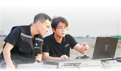 Sun Jinggui (R), a drone swarm flight planner at CroStars Technology Group, tests a drone with his colleague. (Photo/Wang Peng)