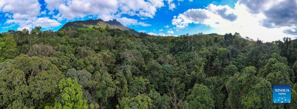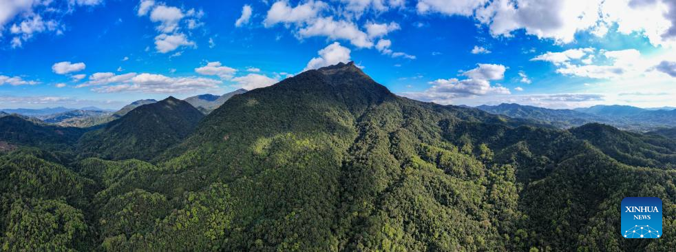 An aerial panoramic drone photo taken on Feb. 4, 2026 shows a view of the Wuzhishan section of the Hainan Tropical Rainforest National Park in south China's Hainan Province. Wuzhishan section is a core part of the Hainan Tropical Rainforest National Park. (Xinhua/Yang Guanyu)