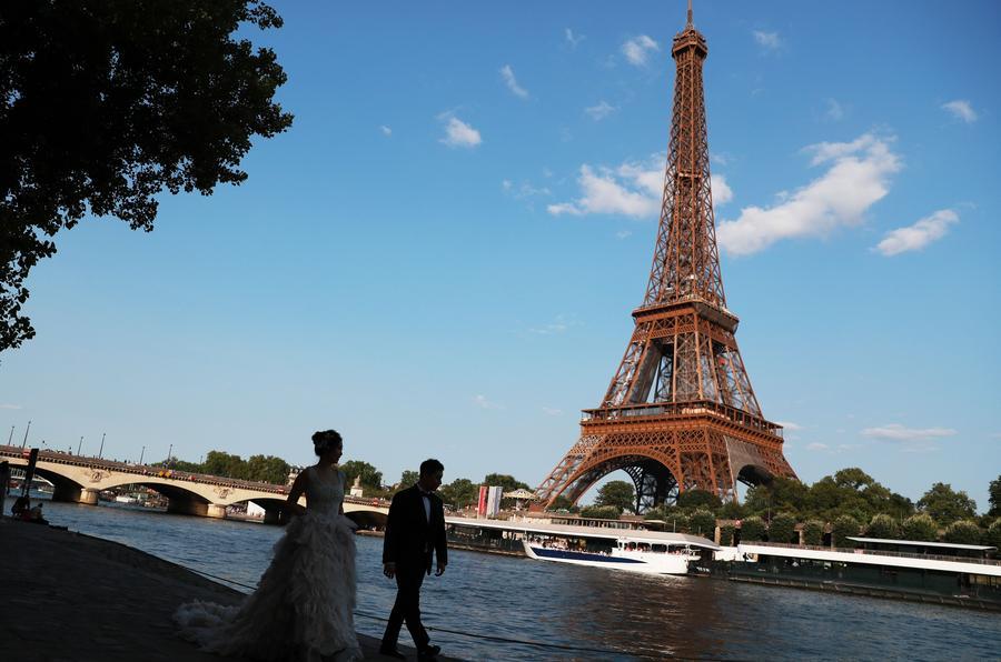 A couple from China poses for wedding photos by the Seine River in Paris, France, June 27, 2023. (Xinhua/Gao Jing)