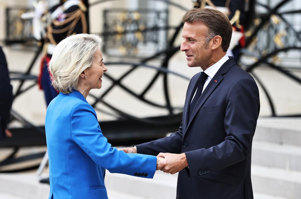French President Emmanuel Macron (R) greets European Commission President Ursula von der Leyen upon her arrival to attend the meeting of the "Coalition of the Willing" at the Elysee Palace in Paris, France, Sept. 4, 2025. (Xinhua/Gao Jing)