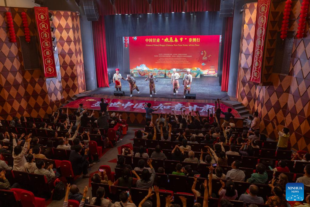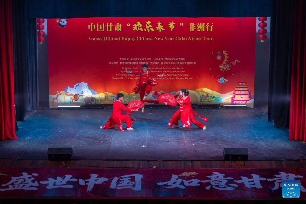 Actors dance at the Kenya National Theatre in Nairobi, Kenya, on Feb. 9, 2026. A vibrant cultural show featuring Chinese martial arts, acrobatics and dance was staged here on Monday during the Gansu (China) Happy Chinese New Year Gala: Africa Tour. (Xinhua/Xie Jianfei)