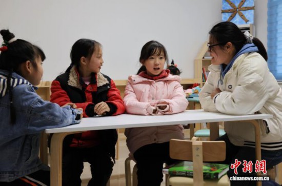 A volunteer interacts with the children of employees who work for a local company dedicated to the preservation and commercialization of traditional Tujia brocade weaving, a national intangible cultural heritage item. The company offers flexible working hours and child care support for female employees. (Photo/Wu Yongbing)