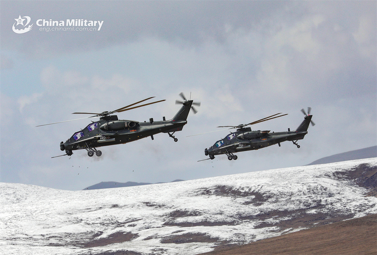 Z-10 attack helicopters attached to an army brigade under the Chinese PLA Xizang Military Command fire at the targets at ultra-low altitude during a training exercise in snow-covered plateau region in early January, 2026. (eng.chinamil.com.cn/Photo by Hu Qiwu)