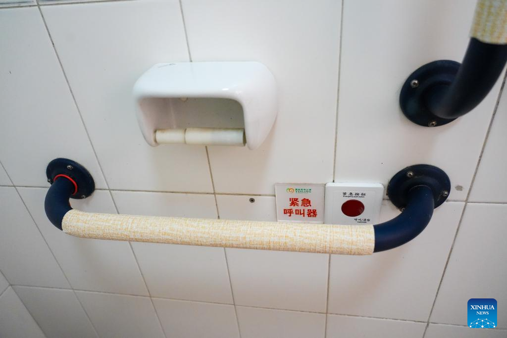 This photo taken on Feb. 10, 2026 shows safety handrails and an emergency call button at a bathroom at a senior care center in Beijing, capital of China. (Xinhua/Xie Han)