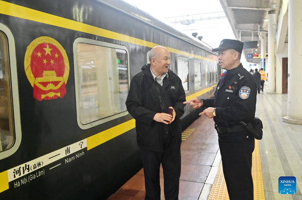 Approaching retirement, Huang cherishes his role deeply, "Serving as a railway police officer on the China-Vietnam international passenger rail service, safeguarding the trains' security and passengers' safety, has been an honorable and unforgettable experience in my career." (Xinhua/Lu Boan)