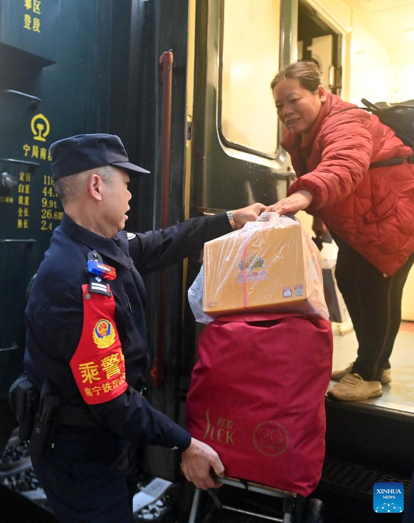 Huang Qingming helps a passenger with her belongings at the Chongzuo Railway Station in Chongzuo, south China's Guangxi Zhuang Autonomous Region, Feb. 11, 2026. The China-Vietnam international passenger rail service, which resumed operations on May 25, 2025, is now facing its first Spring Festival travel rush. Huang Qingming, a 58-year-old railway police officer, has been working on this route since 2012, responsible for the Nanning-Pingxiang section of trains No. T8701 and No. T8702 in Guangxi.