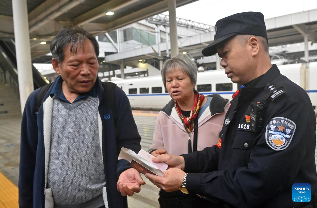 Huang Qingming talks with a passenger at a platform of the Nanning Railway Station in Nanning, south China's Guangxi Zhuang Autonomous Region, Feb. 10, 2026. The China-Vietnam international passenger rail service, which resumed operations on May 25, 2025, is now facing its first Spring Festival travel rush. Huang Qingming, a 58-year-old railway police officer, has been working on this route since 2012, responsible for the Nanning-Pingxiang section of trains No. T8701 and No. T8702 in Guangxi.