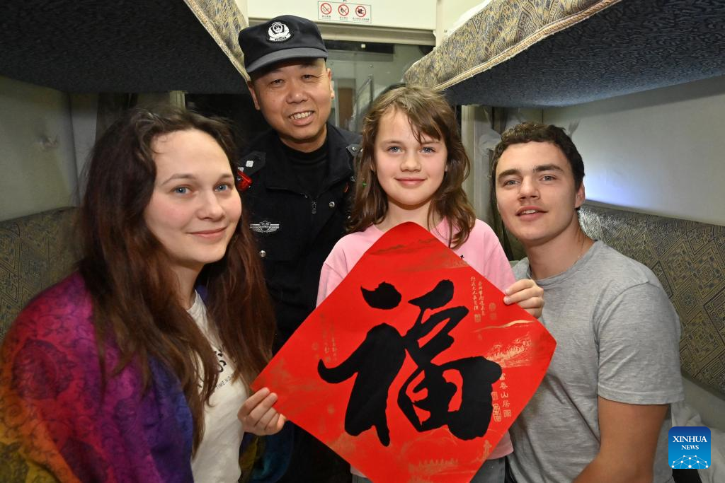 Huang Qingming gives a Chinese character "Fu" (meaning good fortune) to foreign passengers on the train No. T8701 in south China's Guangxi Zhuang Autonomous Region, Feb. 10, 2026. The China-Vietnam international passenger rail service, which resumed operations on May 25, 2025, is now facing its first Spring Festival travel rush. Huang Qingming, a 58-year-old railway police officer, has been working on this route since 2012, responsible for the Nanning-Pingxiang section of trains No. T8701 and No. T8702 in Guangxi.