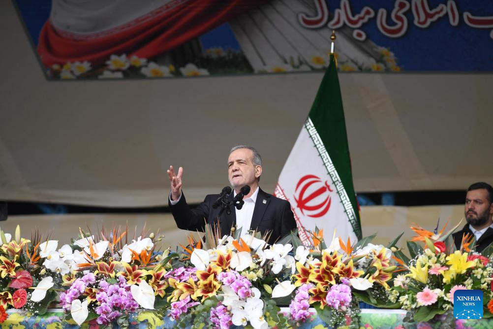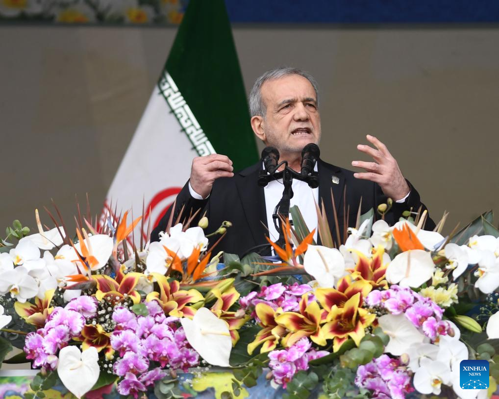 Iranian President Masoud Pezeshkian delivers a speech at the celebrations to mark the 47th anniversary of the 1979 Islamic Revolution in Tehran, Iran, Feb. 11, 2026. The "wall of distrust" created by the West and U.S. excessive demands impede the progress of nuclear talks between Tehran and Washington, Iranian President Masoud Pezeshkian said here Wednesday. He made the remarks while delivering a speech at the celebrations in the capital to mark the 47th anniversary of the 1979 Islamic Revolution. Pezeshkian said Iran does not seek nuclear weapons and is "ready for any verification of that." (Xinhua/Shadati)