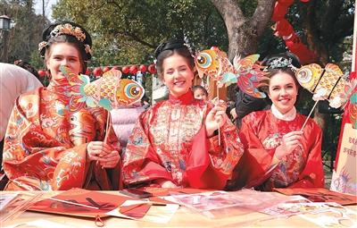 Foreign tourists make fish-shaped lanterns at a fair in Zhoushan, east China's Zhejiang Province. (Photo/Chen Yongjian)