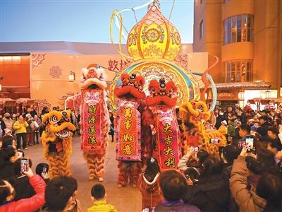 Tourists watch a lion dance performance in Dunhuang, northwest China's Gansu Province. (Photo/Zhang Xiaoliang)