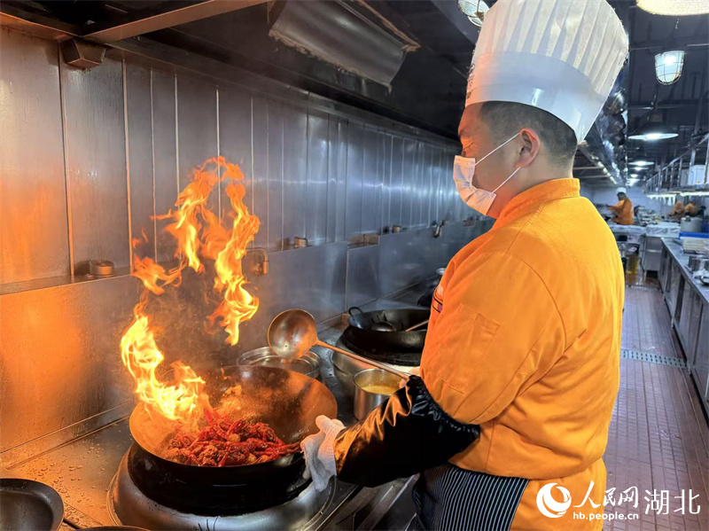 A chef cooks braised crayfish at a restaurant in central China's Hubei Province. (People's Daily Online/Zhang Jun)