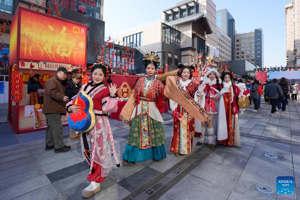 Staff members wearing traditional costumes interact with tourists during a festive fair held at the Longfusi commercial area in Dongcheng District of Beijing, capital of China, Feb. 12, 2026. The fair held in celebration of the upcoming Spring Festival creates diverse consumption scenarios for citizens and tourists. It will last until March 3. (Xinhua/Ju Huanzong)