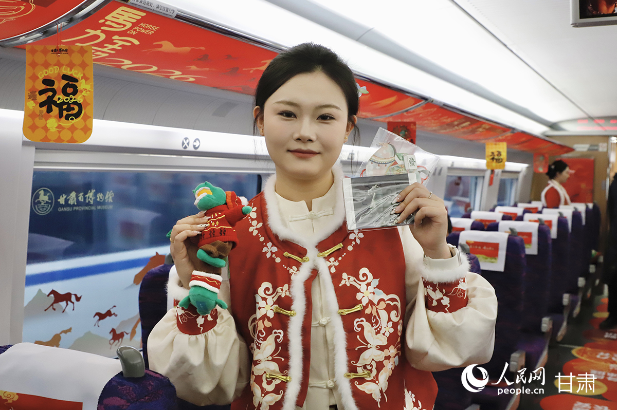 A staff member from the Gansu Provincial Museum showcases creative cultural products on train G848, running from Lanzhou West Railway Station in Lanzhou, northwest China's Gansu Province, to Guangzhou South Railway Station in Guangzhou, south China's Guangdong Province, on Feb. 9, 2026. (People's Daily Online/Jiao Long)