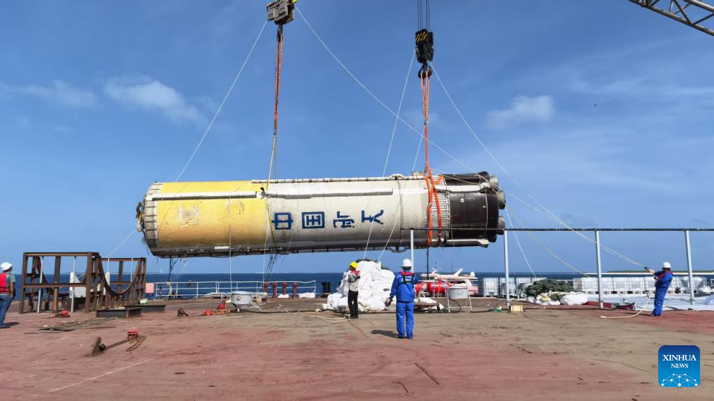 WENCHANG, Hainan, Feb. 13 (Xinhua) -- The first stage of the Long March-10 carrier rocket has been successfully fished out and retrieved from the sea, marking China's completion of its first-ever rocket first-stage booster maritime salvage and recovery mission.