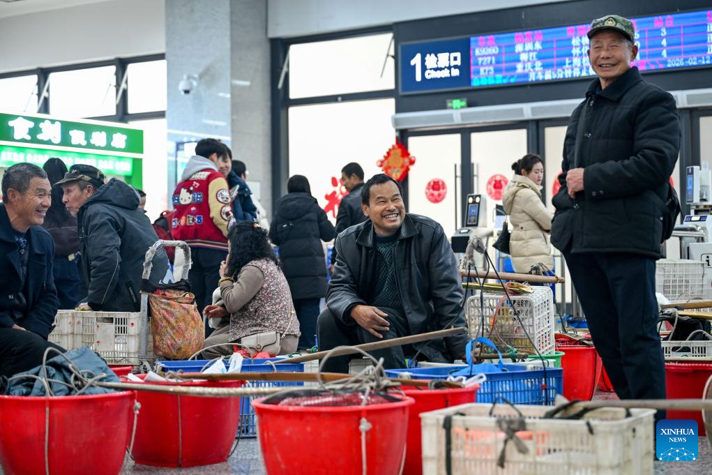 Villagers from Hunan Province talk at the Tongren Railway Station in Tongren City, southwest China's Guizhou Province, Feb. 12, 2026. The train No. 7272/7271 has run across the mountainous areas in Hunan, Guizhou and Chongqing for almost 20 years. With an average speed of just 40 kilometers per hour, the train has made it easier for residents along the route to travel and commute, while also helping local products reach wider markets. (Photo by Yuan Fuhong/Xinhua)