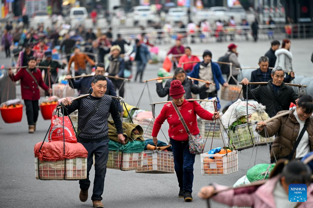 Farmers from Hunan Province carrying goods for sale walk to a market in Tongren City, southwest China's Guizhou Province, Feb. 12, 2026. The train No. 7272/7271 has run across the mountainous areas in Hunan, Guizhou and Chongqing for almost 20 years. With an average speed of just 40 kilometers per hour, the train has made it easier for residents along the route to travel and commute, while also helping local products reach wider markets. (Photo by Yuan Fuhong/Xinhua)