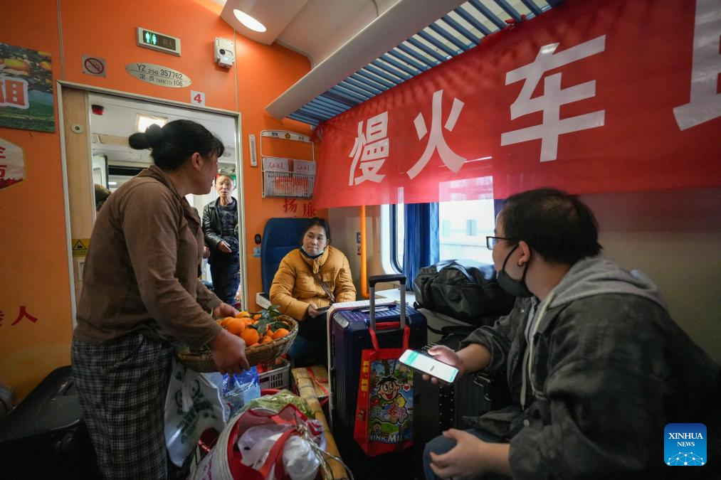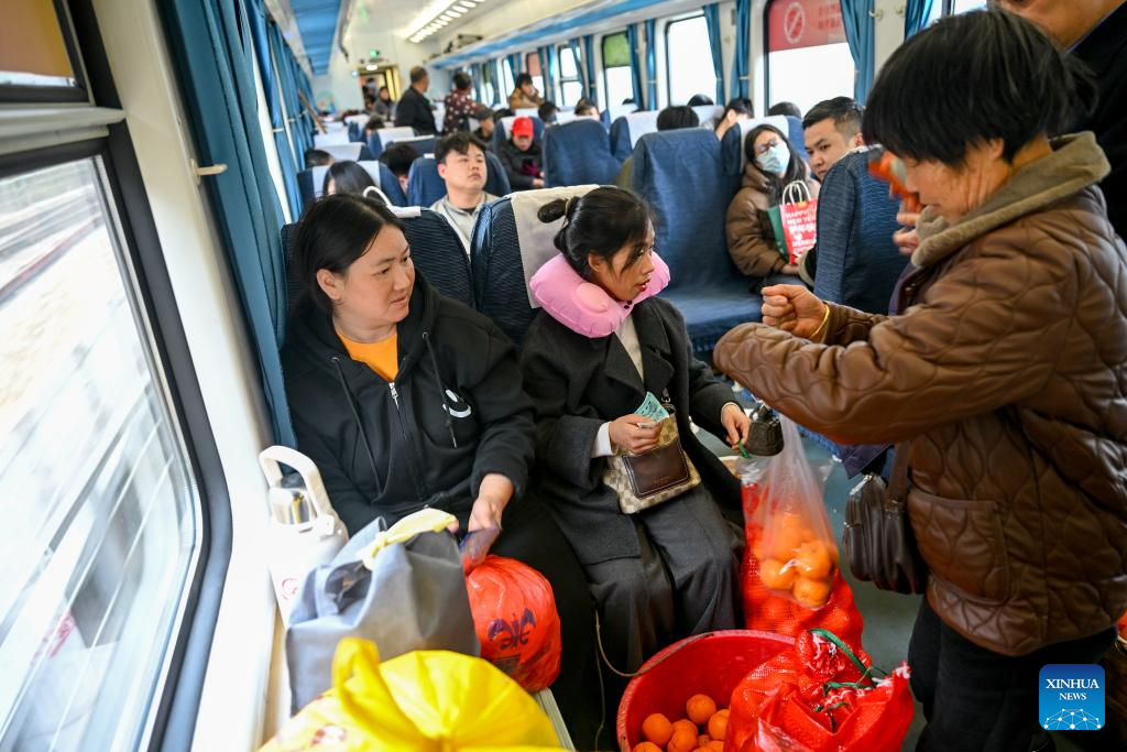 A villager (R) from Hunan Province sells fruits to passengers on the train No. 7272 on Feb. 12, 2026. The train No. 7272/7271 has run across the mountainous areas in Hunan, Guizhou and Chongqing for almost 20 years. With an average speed of just 40 kilometers per hour, the train has made it easier for residents along the route to travel and commute, while also helping local products reach wider markets. (Xinhua/Liu Xu)