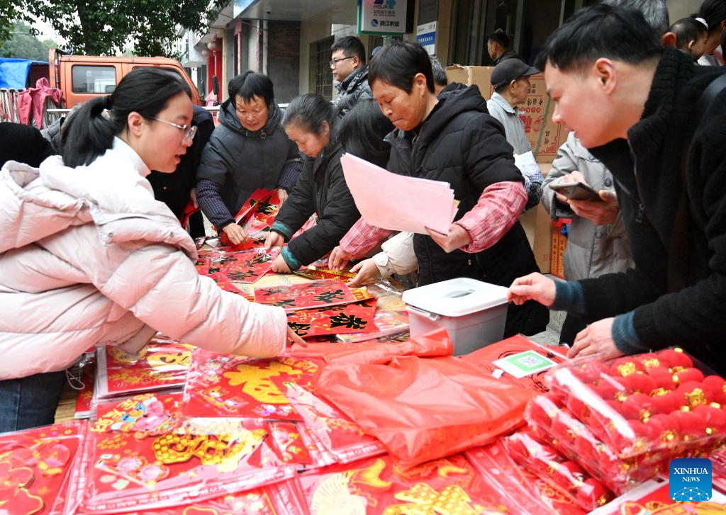 People shop for goods needed for the Chinese New Year celebrations at a market in Guzhu Village in Jinhua City, east China's Zhejiang Province, Feb. 11, 2026. Markets across the country are bustling nowadays as people flock there to stock up on goods in preparation for the upcoming Spring Festival, or the Chinese New Year. (Photo by Zhang Jiancheng/Xinhua)