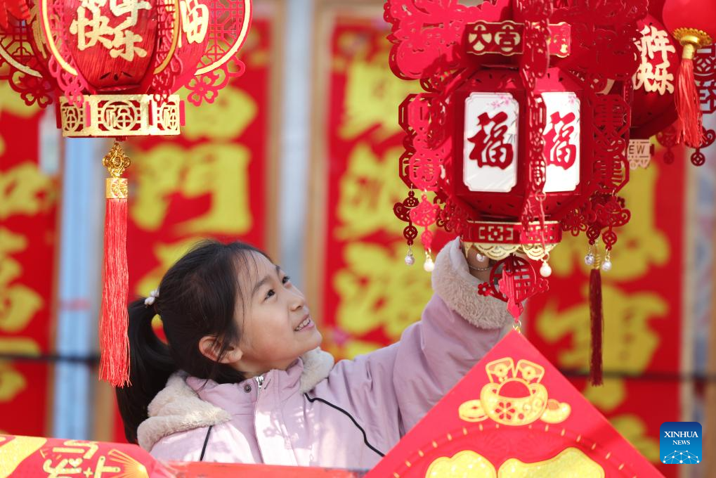 A girl selects Chinese New Year decorations at a market in Tancheng County of Linyi City, east China's Shandong Province, Feb. 13, 2026. Markets across the country are bustling nowadays as people flock there to stock up on goods in preparation for the upcoming Spring Festival, or the Chinese New Year. (Photo by Zhang Chunlei/Xinhua)