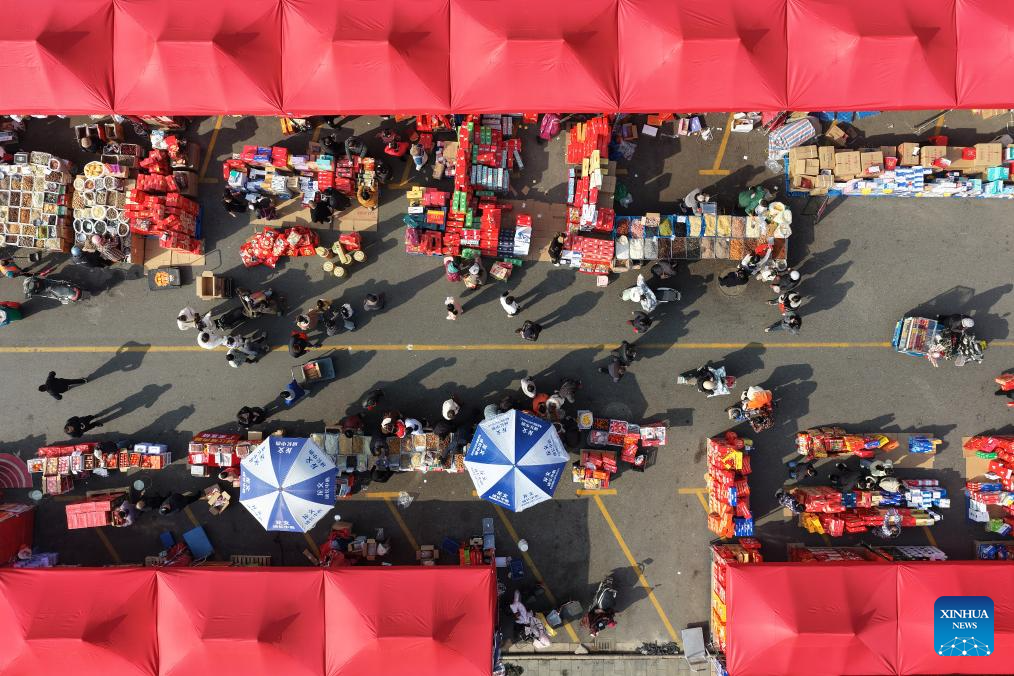 This aerial drone photo shows people purchasing goods needed for the Chinese New Year celebrations at a market in north China's Tianjin, Feb. 10, 2026. Markets across the country are bustling nowadays as people flock there to stock up on goods in preparation for the upcoming Spring Festival, or the Chinese New Year. (Photo by Du Penghui/Xinhua)