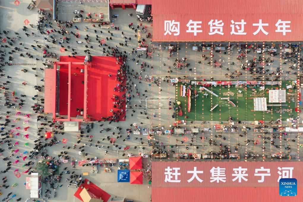 This aerial drone photo shows people purchasing goods needed for the Chinese New Year celebrations at a market in Yinji Township of Huai'an City, east China's Jiangsu Province, Feb. 13, 2026. Markets across the country are bustling nowadays as people flock there to stock up on goods in preparation for the upcoming Spring Festival, or the Chinese New Year. (Photo by Yang Yugang/Xinhua)