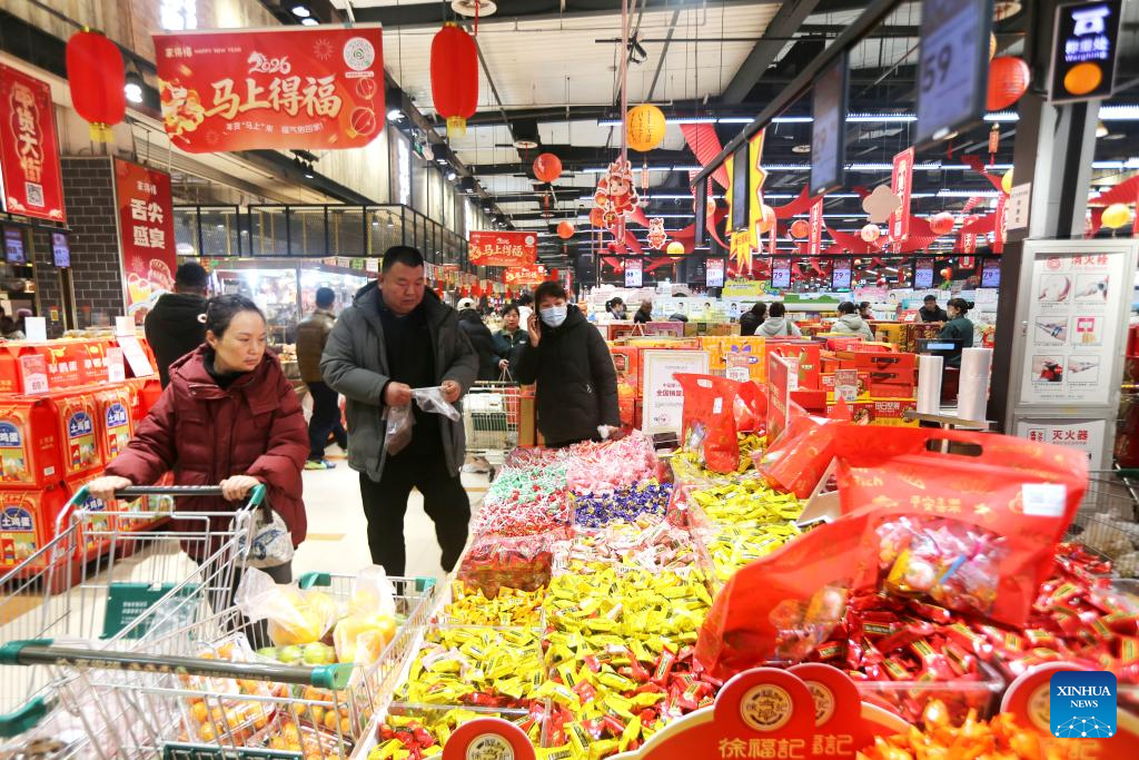 People shop for goods needed for the Chinese New Year celebrations at a market in Kaifeng, central China's Henan Province, Feb. 11, 2026. Markets across the country are bustling nowadays as people flock there to stock up on goods in preparation for the upcoming Spring Festival, or the Chinese New Year. (Photo by Li Junsheng/Xinhua)