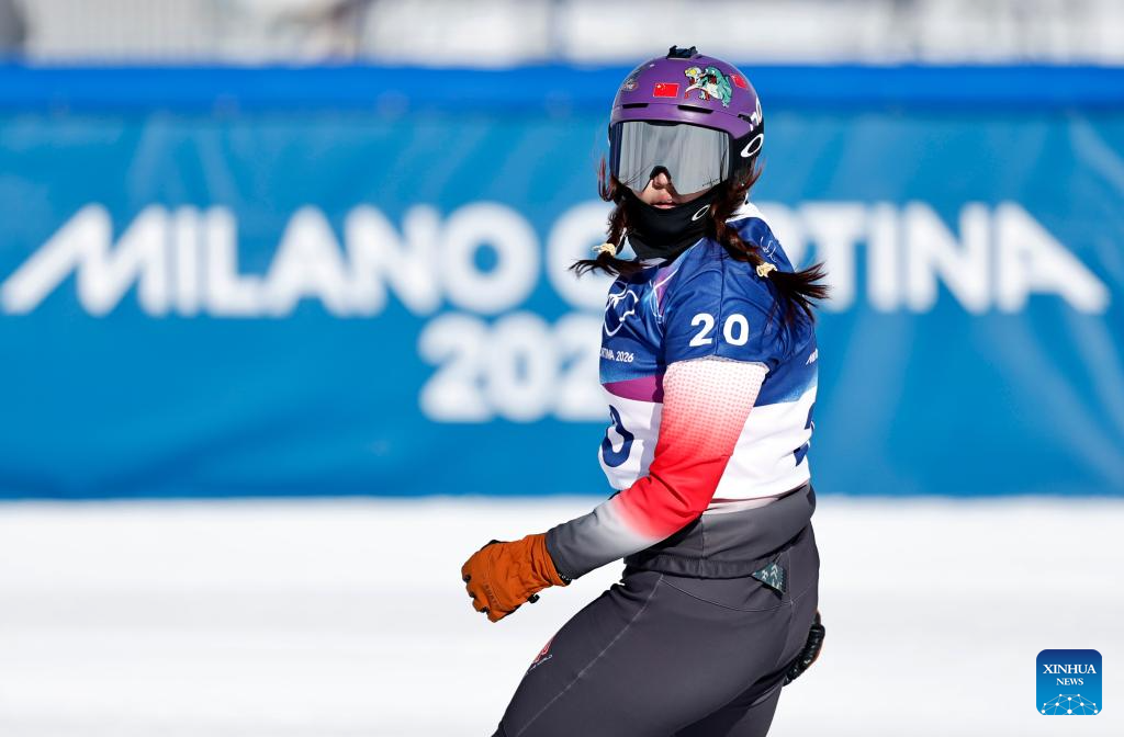 Pang Chuyuan of China competes during the snowboard women's cross seeding at the Milan-Cortina 2026 Olympic Winter Games in Livigno, Italy, Feb. 13, 2026. (Xinhua/Wang Peng)