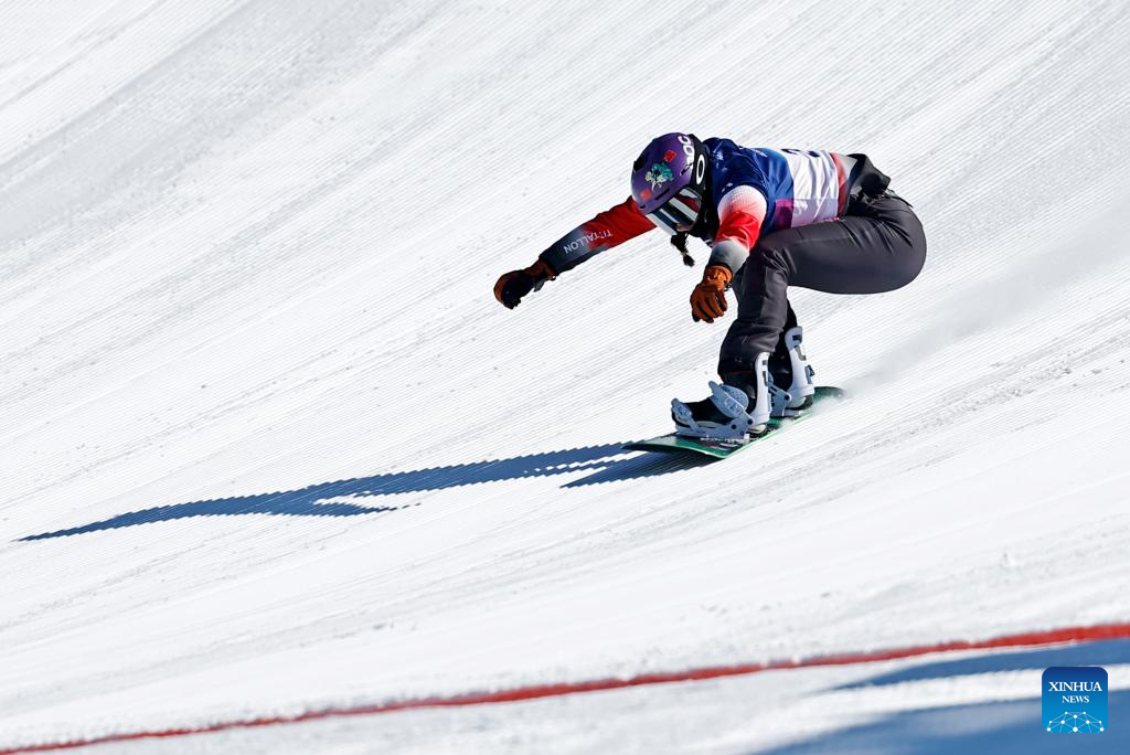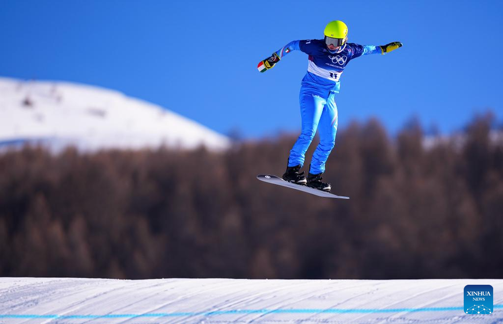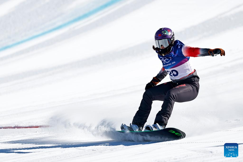 Yongqinglamu of China competes during the snowboard women's cross seeding at the Milan-Cortina 2026 Olympic Winter Games in Livigno, Italy, Feb. 13, 2026. (Xinhua/Wang Peng)