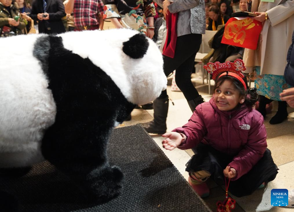 A girl interacts with a panda robot at a Chinese New Year gala at the UN headquarters in New York, on Feb. 12, 2026. (Xinhua/Zhang Fengguo)
