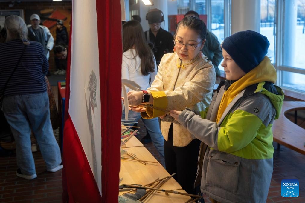 Students try out an intangible cultural heritage shadow puppetry during a "Happy Chinese New Year" campus event at Kulosaari Secondary School in Helsinki, Finland, Feb. 13, 2026. A lively "Happy Chinese New Year" campus event was held at Kulosaari Secondary School in Helsinki on Friday. (Photo by Matti Matikainen/Xinhua)