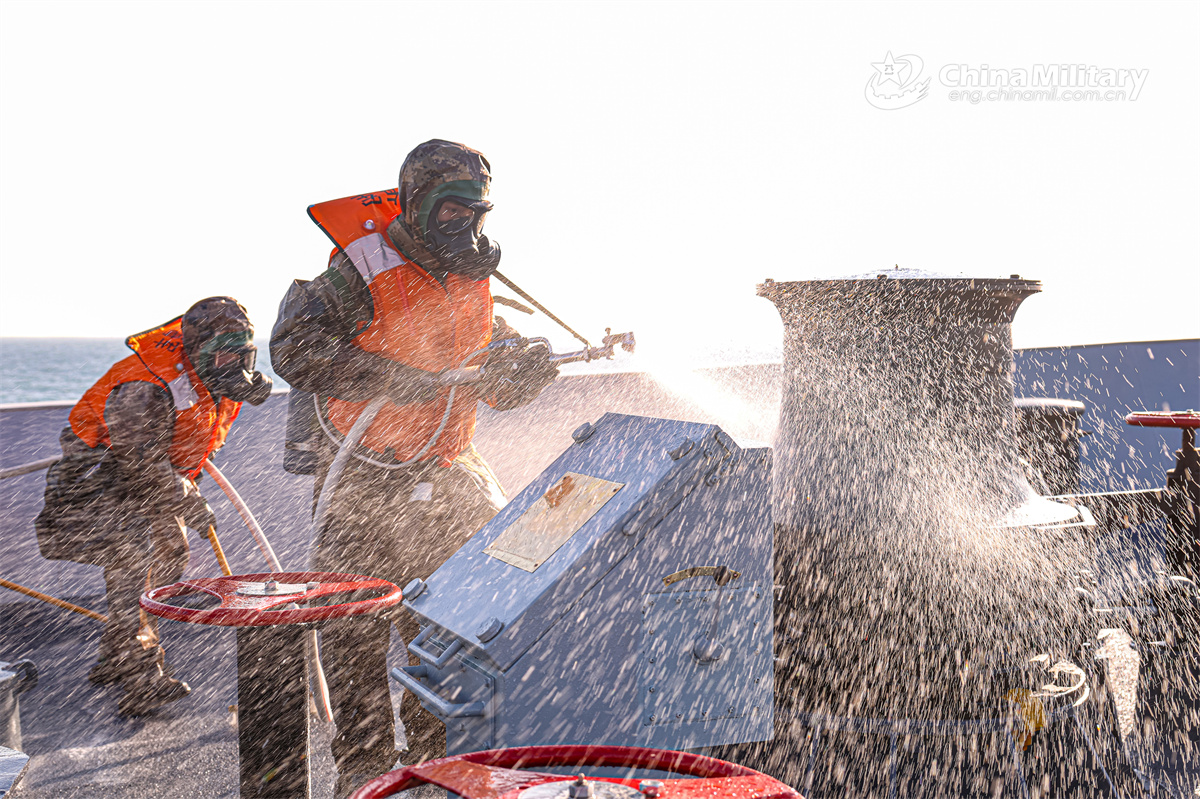 Sailors assigned to a flotilla under the Chinese PLA Navy decontaminate the simulated contaminated area on the warship during a multi-subject training exercise in early January, 2026. (eng.chinamil.com.cn/Photo by Yang Haifan)