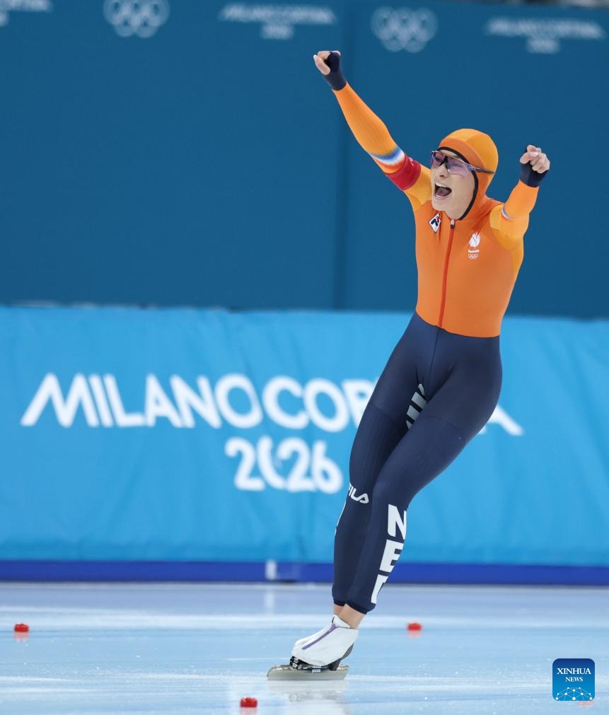 Femke Kok of the Netherlands celebrates after the speed skating women's 500m final match at the Milan-Cortina 2026 Olympic Winter Games in Milan, Italy, Feb. 15, 2026. (Xinhua/Li Jing)