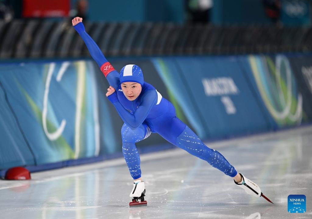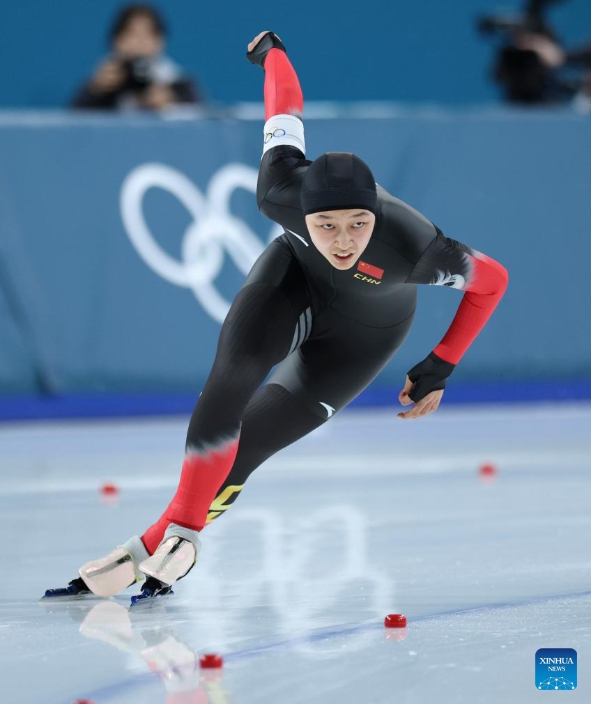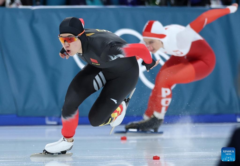 Tian Ruining of China competes during the speed skating women's 500m final match at the Milan-Cortina 2026 Olympic Winter Games in Milan, Italy, Feb. 15, 2026. (Xinhua/Li Jing)