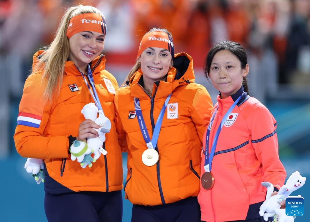 Gold medalist Femke Kok (C) of the Netherlands, silver medalist Jutta Leerdam (L) of the Netherlands and bronze medalist Takagi Miho of Japan attend the awarding ceremony of the speed skating women's 500m at the Milan-Cortina 2026 Olympic Winter Games in Milan, Italy, Feb. 15, 2026. (Xinhua/Wu Wei)